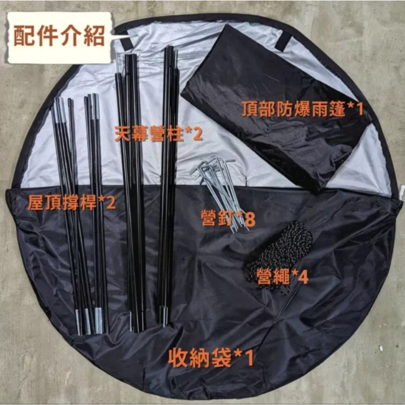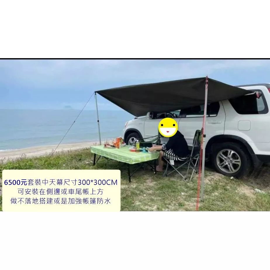 本產品另有搭配天幕可以加購,材質牛津布420T/PU3000MM,尺寸300*300CM,防水能力更好如果高海拔車露建議加購,天氣好時亦可當防潮墊野餐墊喔